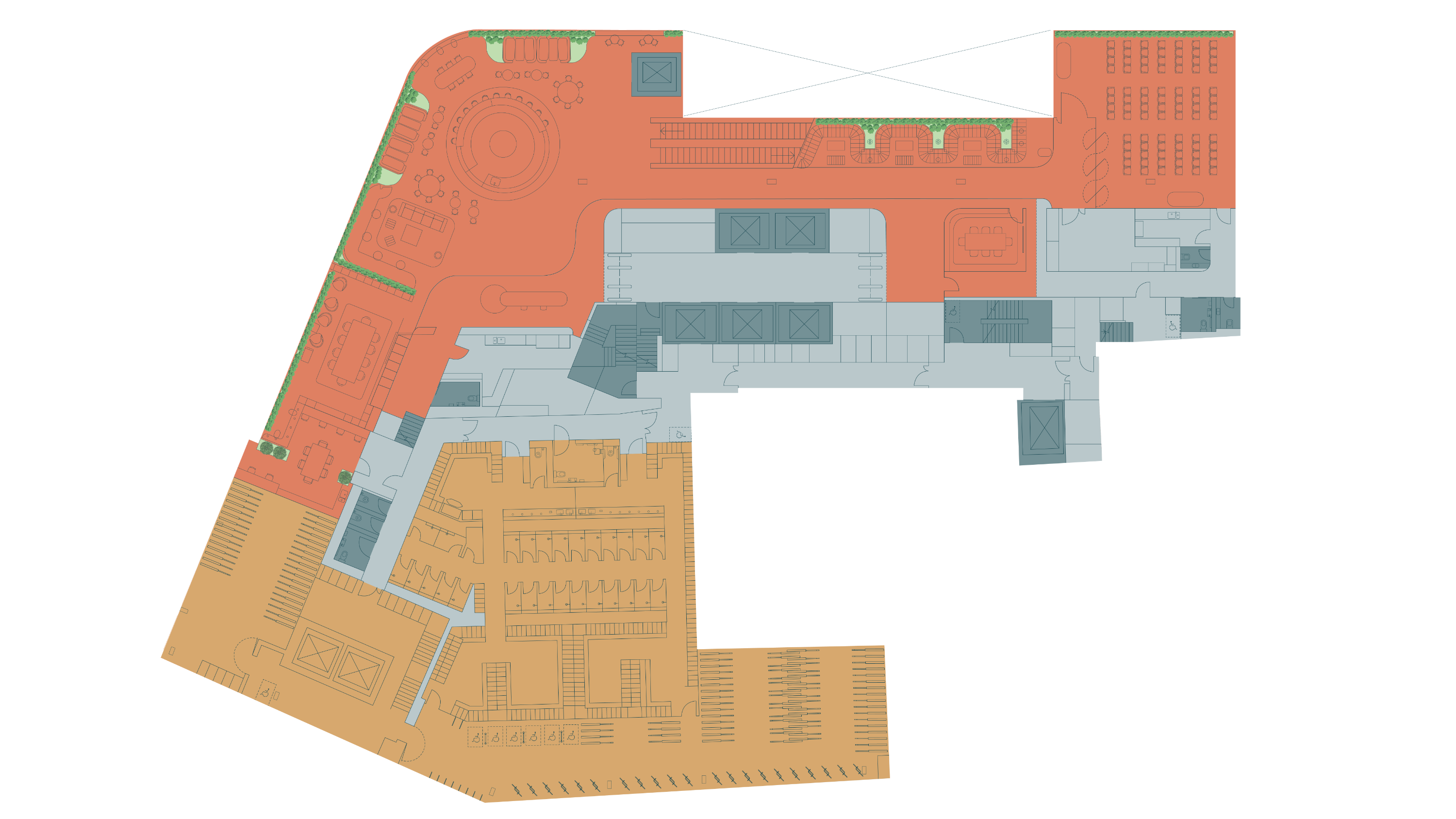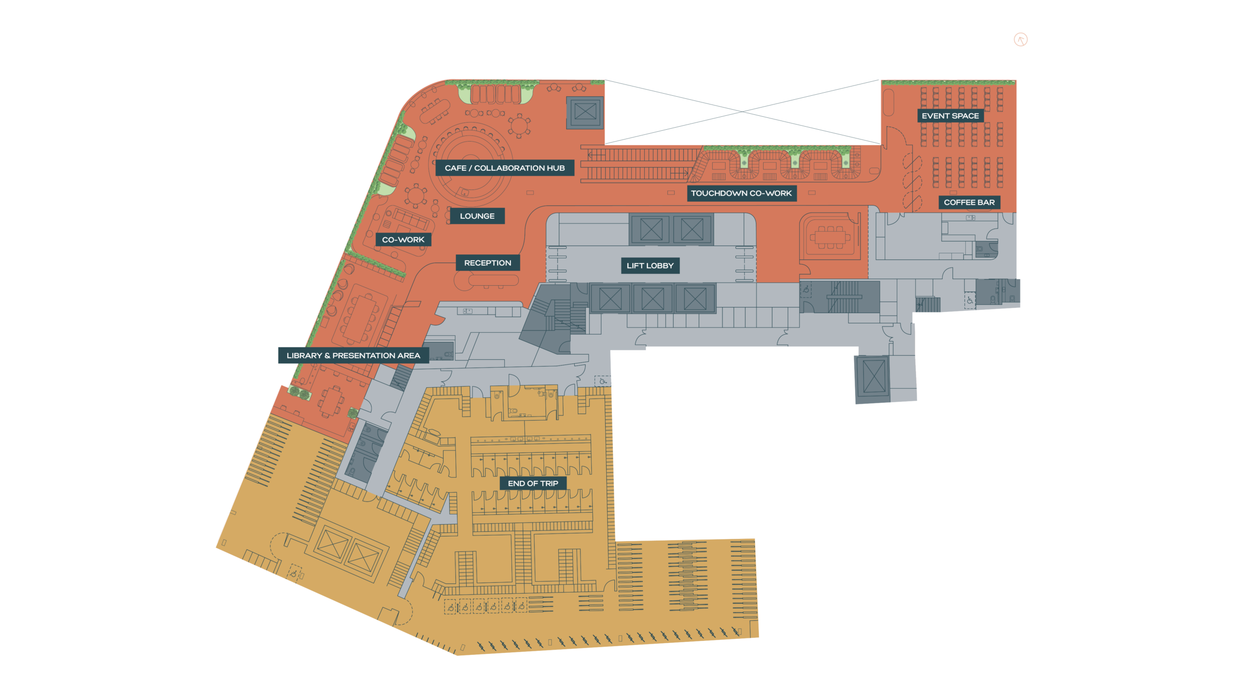 A 175,000 sq ft building designed for collaboration, with the level one amenity hub, event space, library and presentation area.